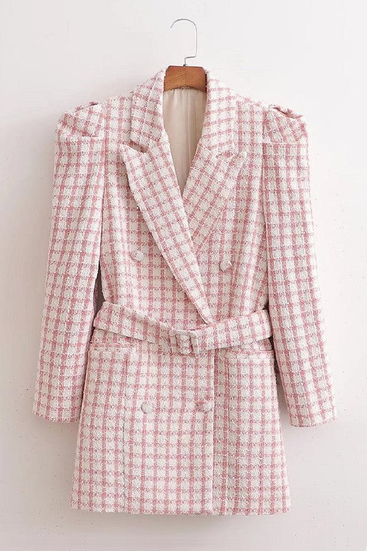 TWEED TEXTURED PLAID DOUBLE BREASTED LONG BLAZER