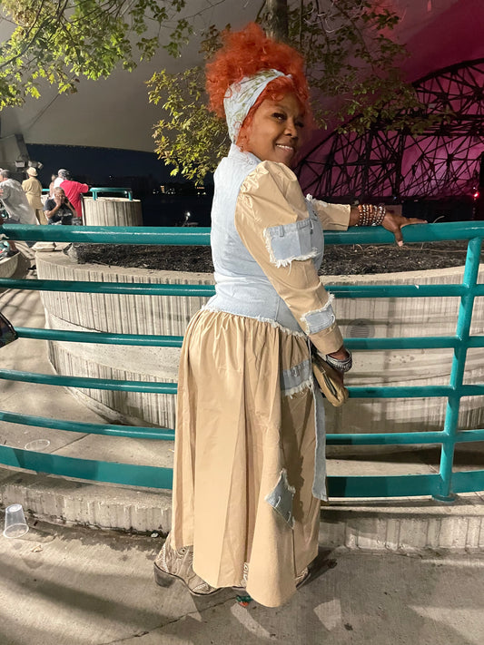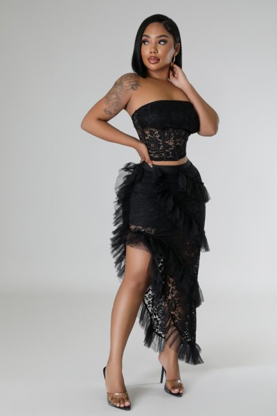 MODEL WEARS SIZE SMALL. DISTRESSED DENIM SKIRT. POCKETS AND BUTTON CLOSURE.