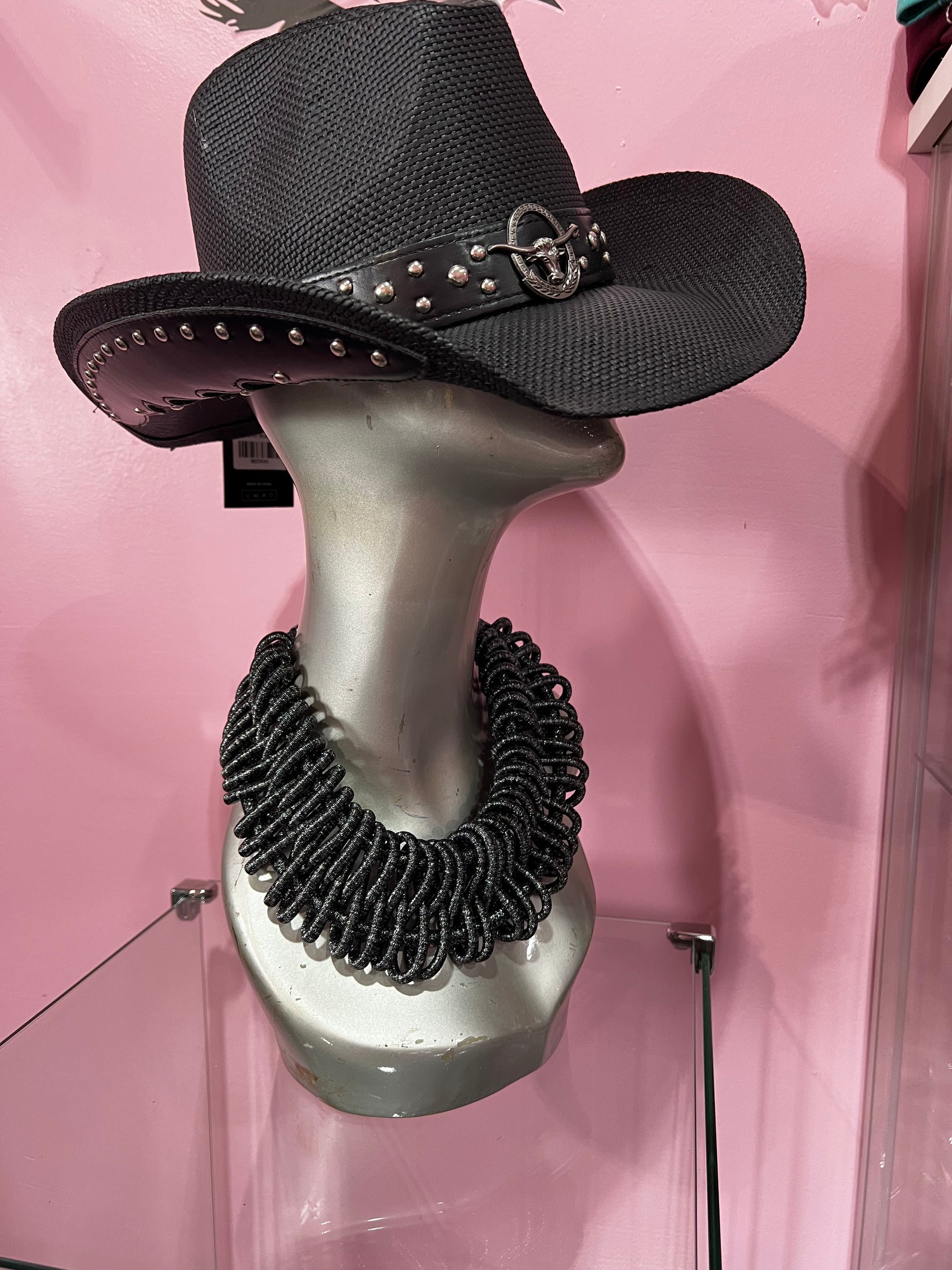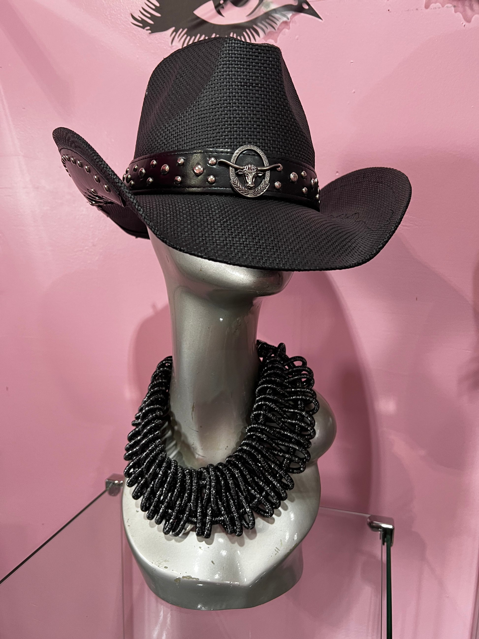 • Add bold flair with this western hat featuring a studded band, bull badge detail, and edgy trim accents. Ideal for rodeos, country concerts, or themed events, it offers a rugged, adventurous cowboy style.
