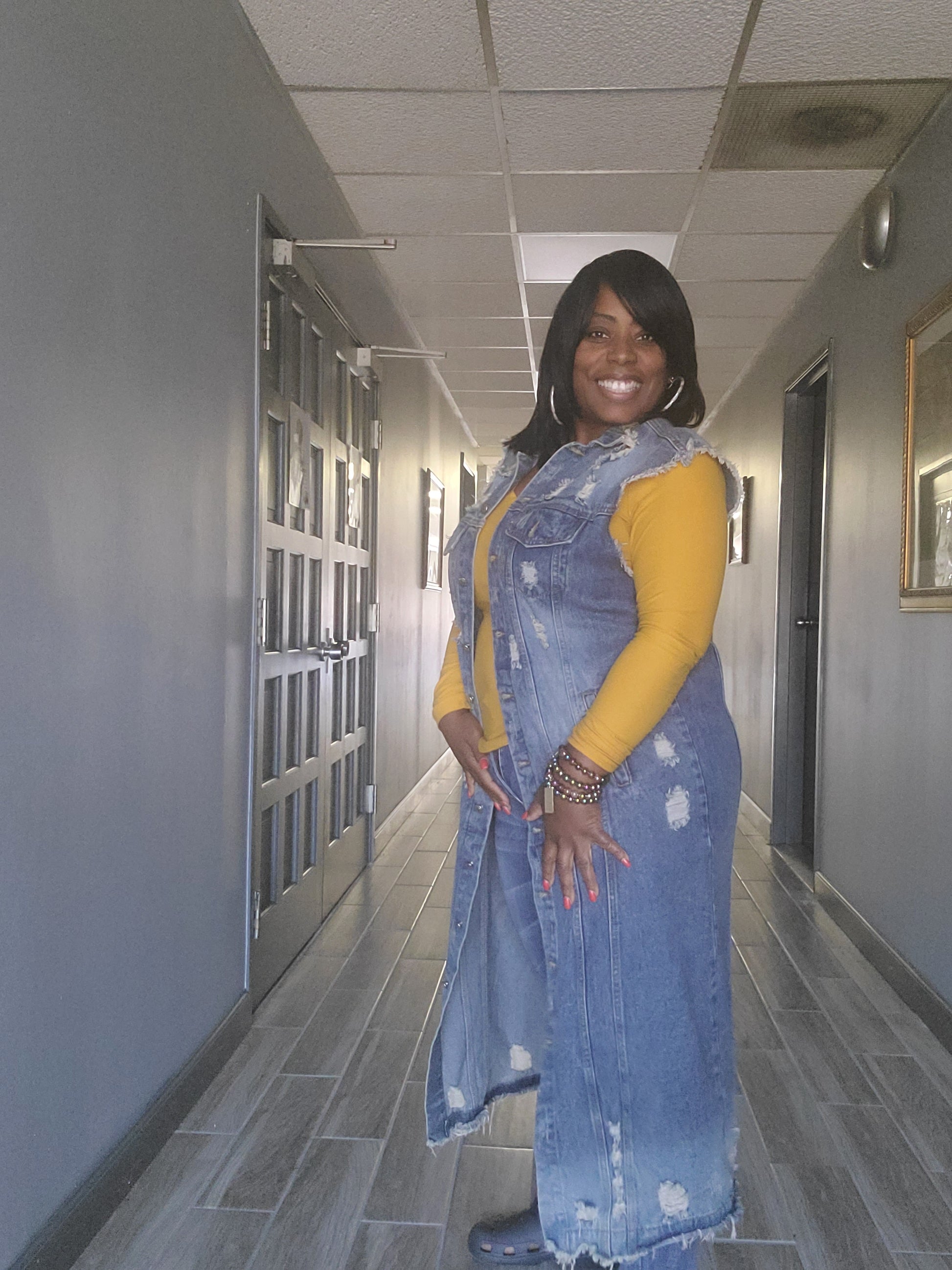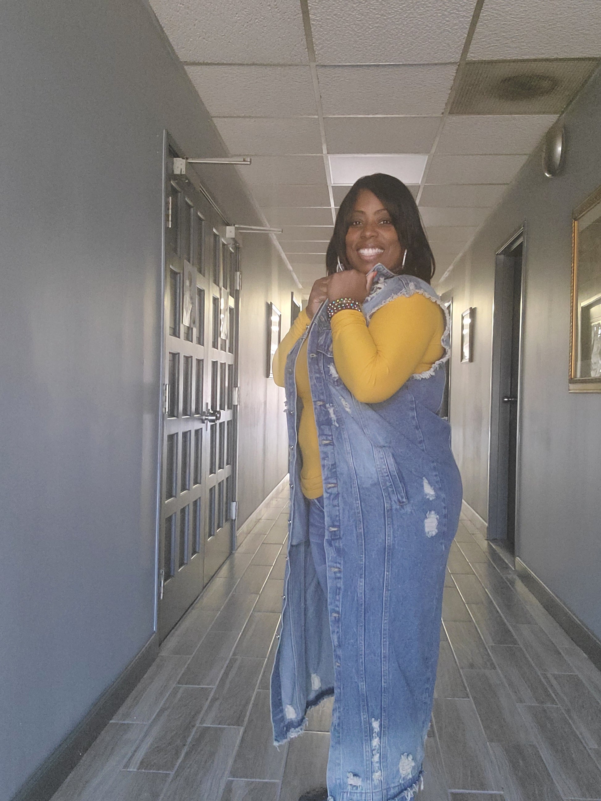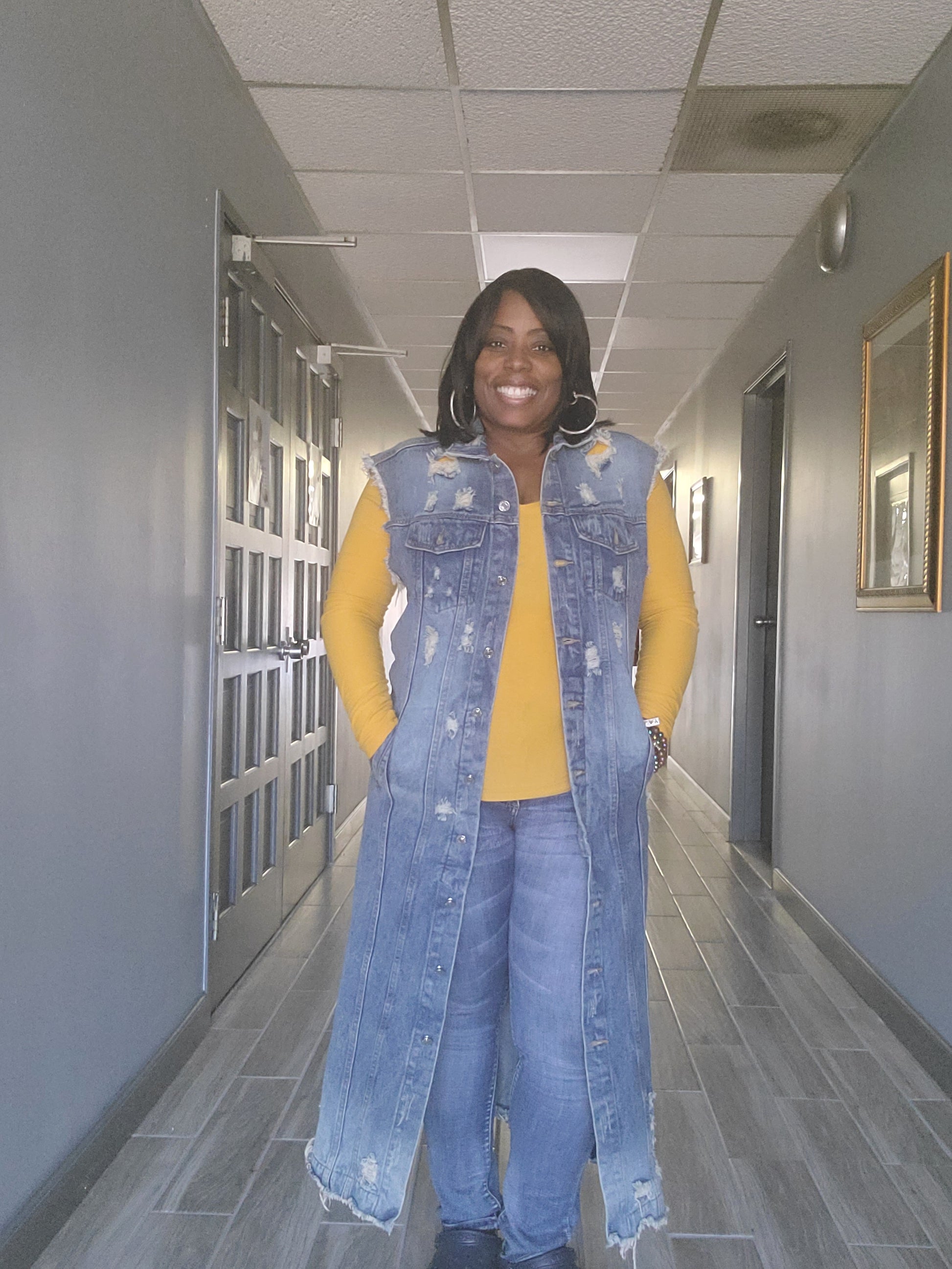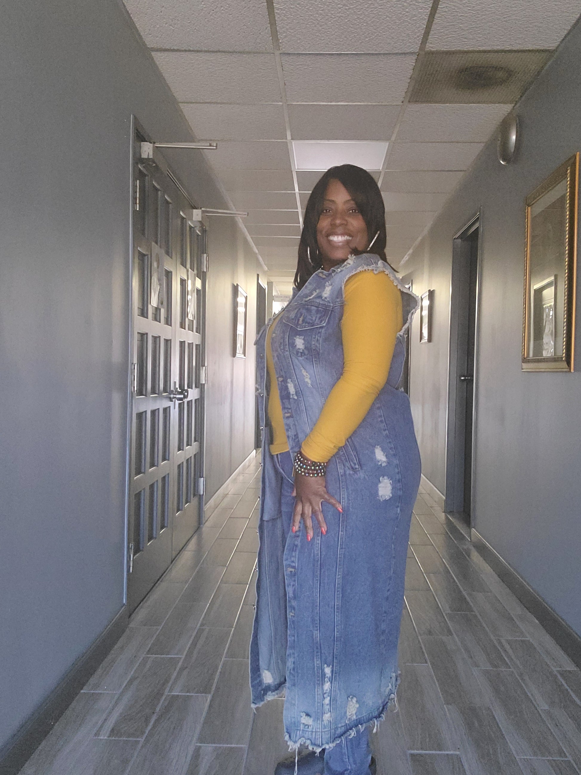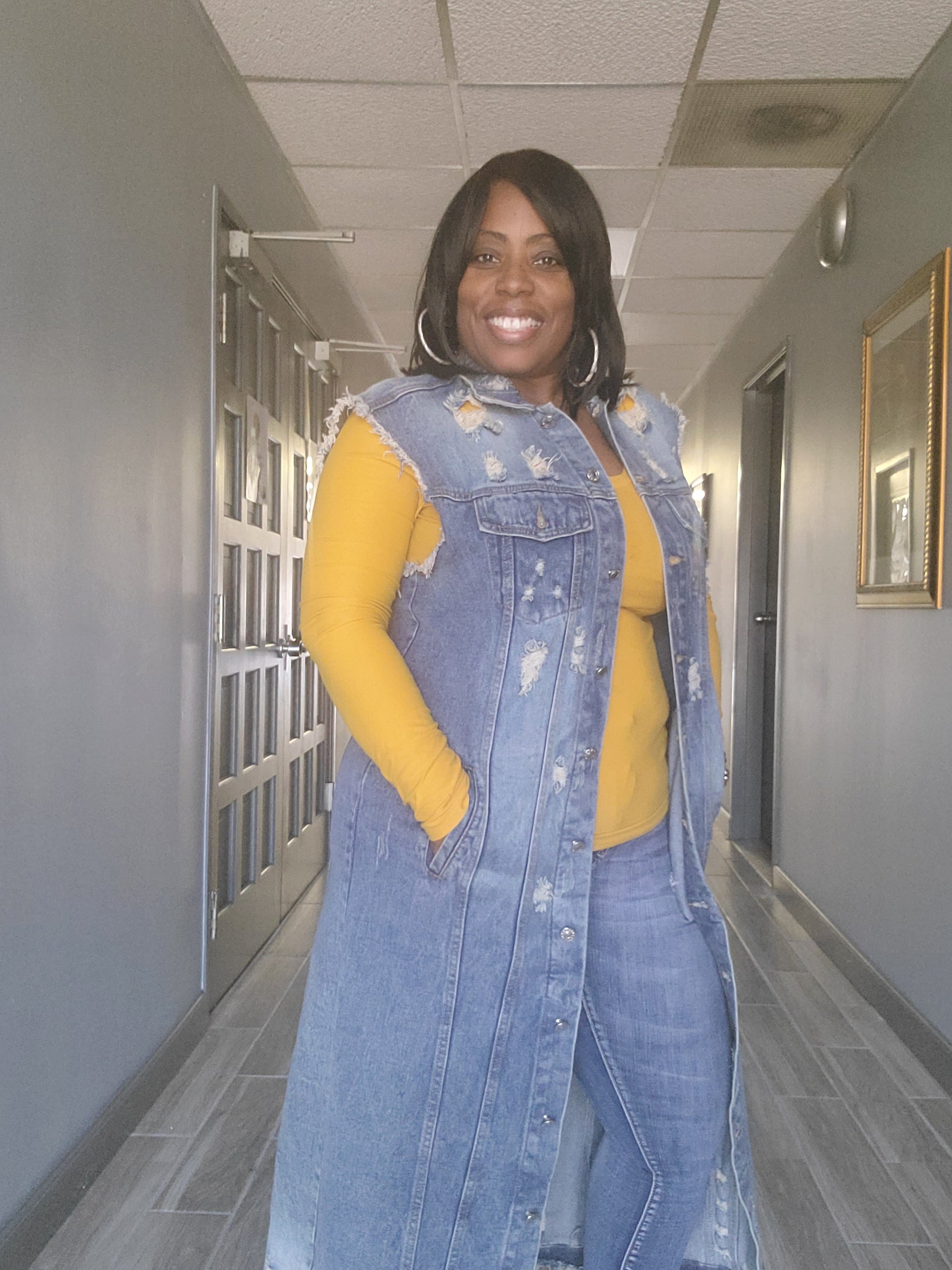 COLLARED BUTTON DOWN RAW EDGE HEM DISTRESSED SLEEVELESS LONG DENIM JACKET WITH SIDE POCKETS * Destroyed Vest Denim Long Jacket - SLEEVELESS DESTROYED DENIM VEST LONG JACKET