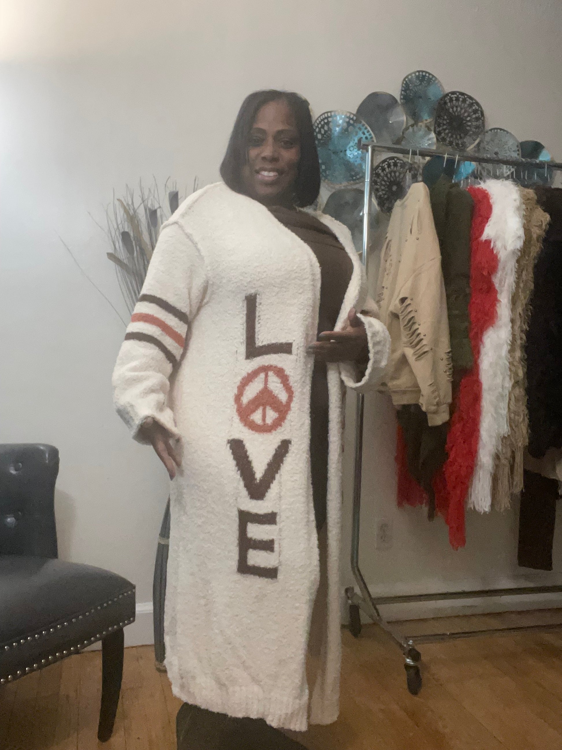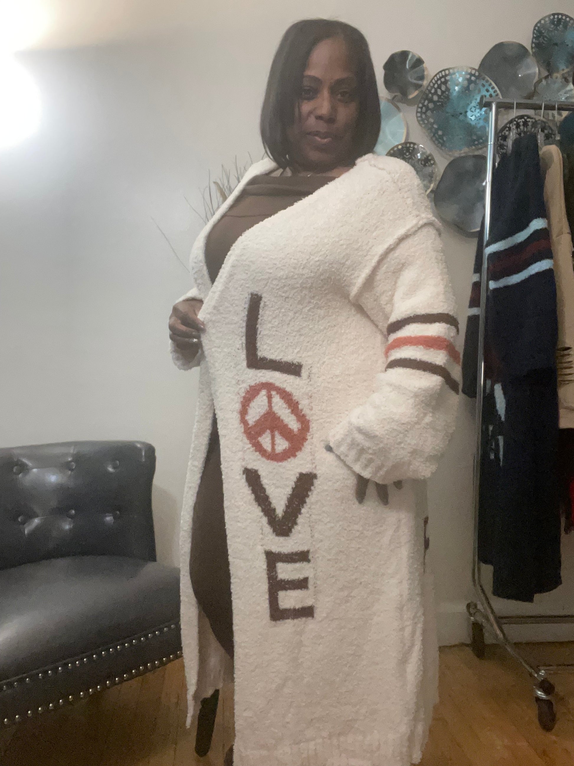 Designed in V-neck balloon sleeve relaxed fit sweater cardigan top in Berber with LOVE letter print with peace mark, color blocked, rib wrist and bottom opening band, solid color.