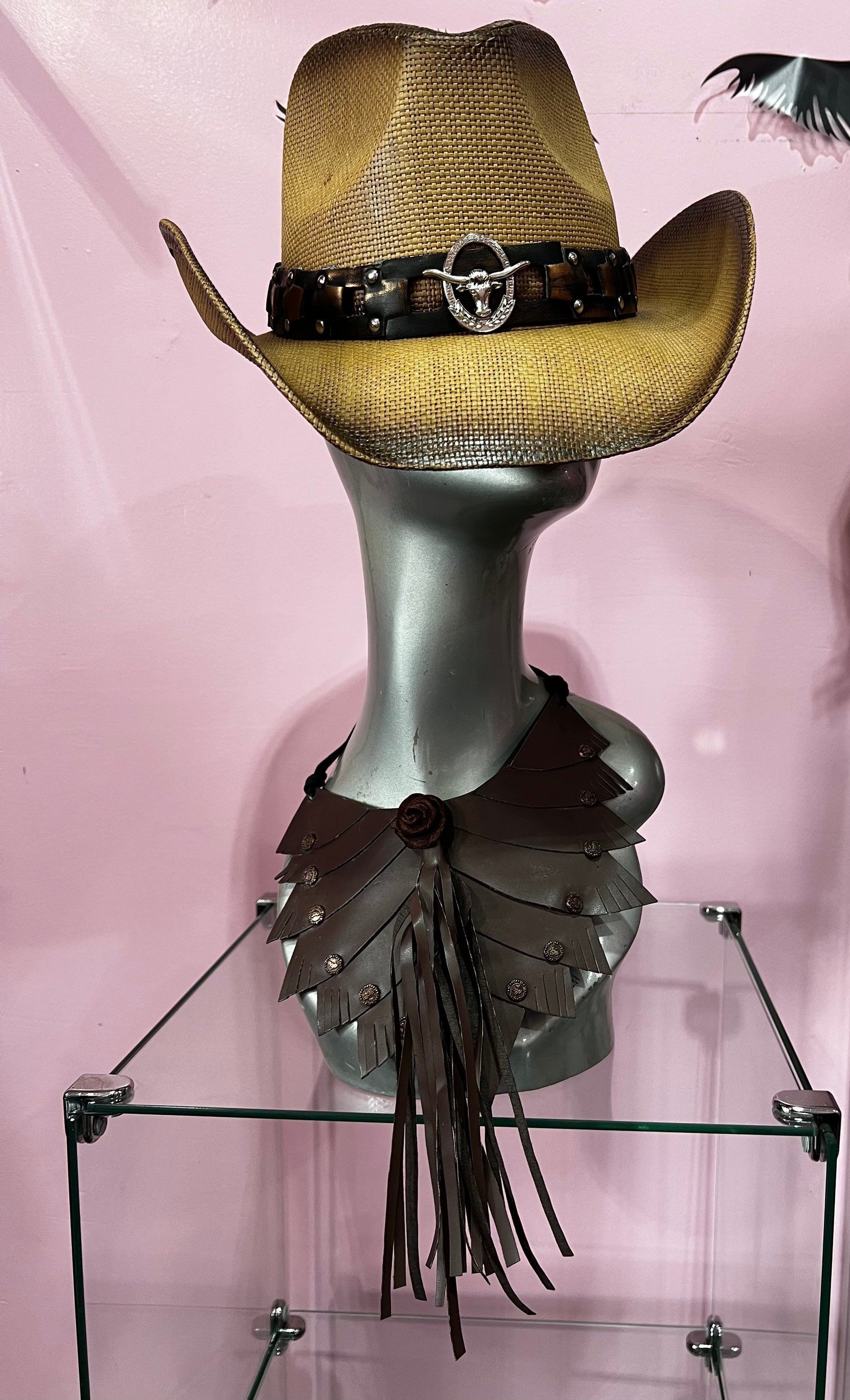 Metal Steer Head Emblem Studded Faux Leather Band Western Straw Cowboy Fedora Hat