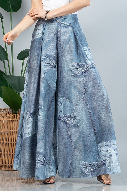 -Denim Abstract Graphic Print -Wide Leg Palazzo Pants -Zipper, Pockets -Inseam 31"